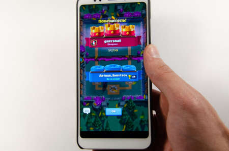 April, 2019. Kramatorsk, Ukraine. Clash Royale gameplay on a white smartphone in hand