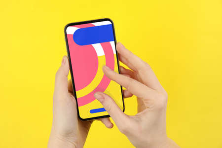 Female hands with modern smartphone on yellow background