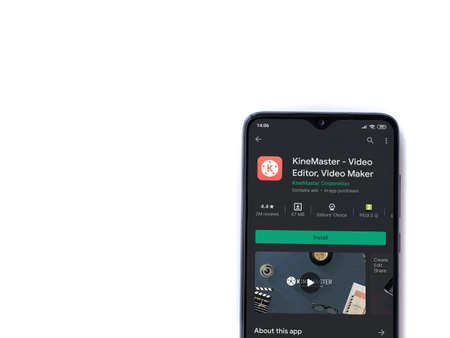 Lod, Israel - July 8, 2020: KineMaster - Video Editor & Movie Maker app play store page on the display of a black mobile smartphone isolated on white background. Top view flat lay with copy space.