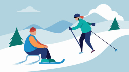 Skiing on Adaptive Slopes A person with a disability is skiing on an adaptive ski device with an instructor guiding them down a gentle slope amid a snowy landscape..