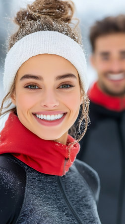 Happy woman and man smiling while exercising outdoors in snowy winter conditions