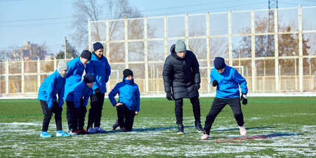 Young football player maneuvering ball through cones with focus, refining footwork during winter training. Concept of sport, school, childhood, discipline, agility, skill progression, active lifestyle
