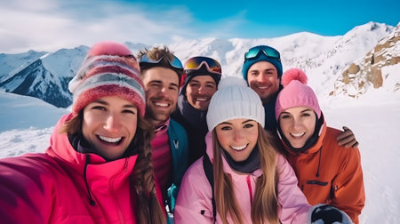 Group of young friends having fun at New Year, on mountains chalet background, smiling and taking selfies. Generative AI