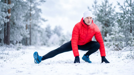 Male athlete in red jacket and hat performs a stretching exercise in a snowy forest, emphasizing fitness and readiness for winter sports activities in a tranquil setting
