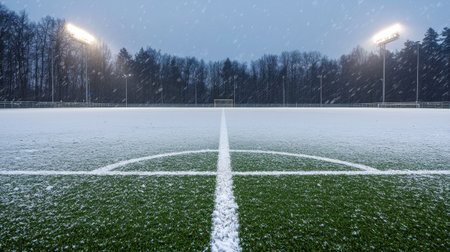 A snowy field with a white line dividing it. The field is empty and the snow is falling