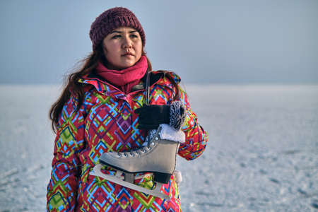 A woman in a ski suit holds skates on her shoulder and looks into the distance, after skiing on a frozen lake