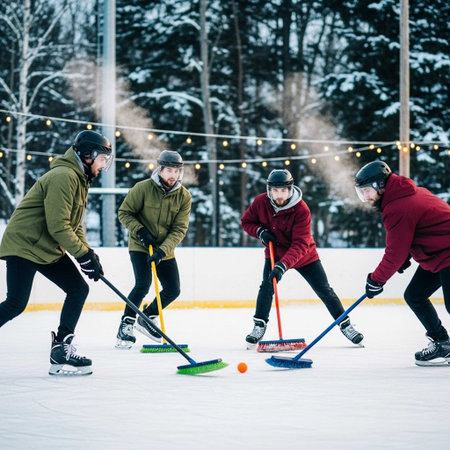 A group of four friends enjoy a game of ice hockey on an outdoor rink surrounded by snow-covered trees and string lights on a cold winter day.