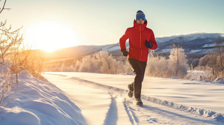 Healthy person running in public park in winter comeliness practicing fitness and strength