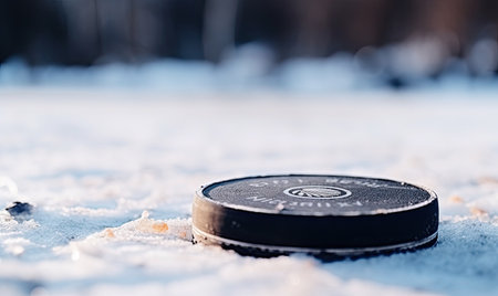 Low-angle shot of a hockey puck on the rink, ice scratches visible for a realistic game feel