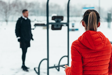 Workout in public park. Woman wearing warm sportswear urban street training exercising outside during winter.