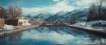 Empty backdrop pool reflects snow-covered mountains under a clear sky