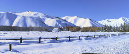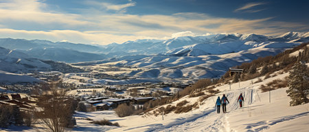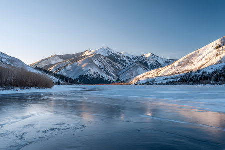 A breathtaking winter landscape showcasing majestic snow-capped mountains and a serene valley, highlighting the beauty and tranquility of nature's winter season.