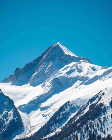 Breathtaking view of majestic snow-capped mountains towering above lush green pine trees under a clear blue sky, capturing the essence of natural beauty and tranquility.