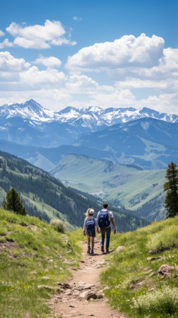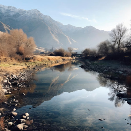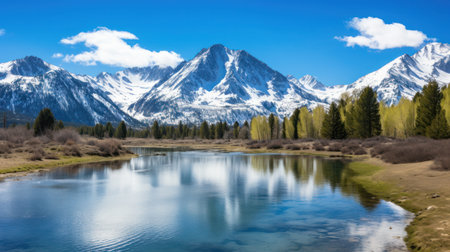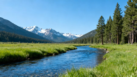 scenic road trip through the mountains, with views of snow-capped peaks and rushing streams, created with generative ai