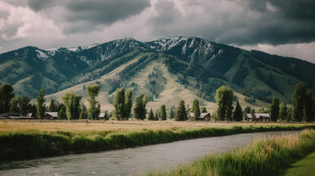 A breathtaking landscape featuring a wide river flowing through a green valley towards a large mountain with snow-dusted peaks under a dramatic, cloudy sky.