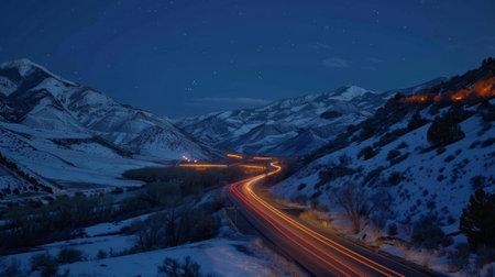 A picturesque mountain pass illuminated by the headlights and taillights of passing vehicles creating a mesmerizing display of light trails