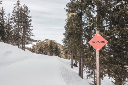 a red sign with the word skiroute stands next to a snow-covered ski route