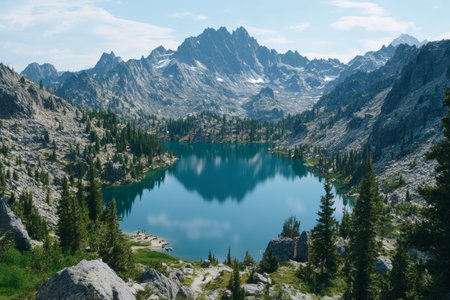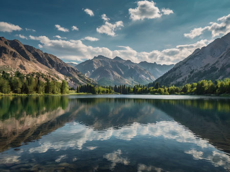 Breathtaking alpine lake surrounded by majestic mountains and lush evergreen forests