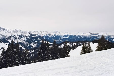 Panorama view of snow covered Austrian Alps in winter on top of Reutte cable car station, with ski slop in foreground, Tyrol, Austria
