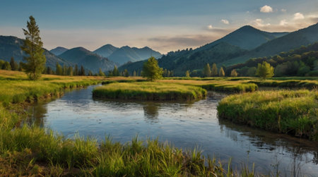 Beautiful summer landscape with lake and mountains in the background at sunset