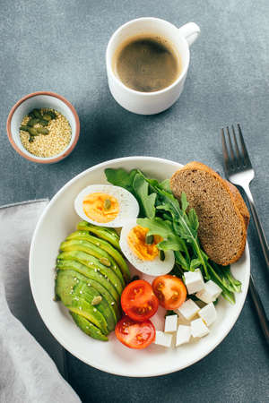 Ketogenic diet breakfast. Fried eggs, salt salmon with microgreens, avocado, cashew nuts and keto toast. Keto lunch. top view, overhead