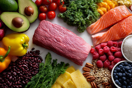 Colorful composition of keto-friendly ingredients - salmon, avocado, eggs, nuts, and seeds - arranged against a vibrant backdrop, providing an appealing visual for dietary and nutritional content.
