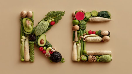An artistic arrangement of fresh vegetables creatively shapes the letters K and E, showcasing vibrant colors and textures. Perfect for promoting healthy eating.