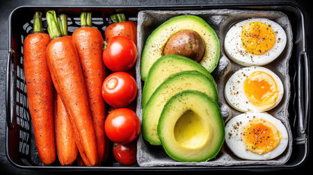 This image showcases an attractive arrangement of fresh vegetables and eggs in a black tray. The vibrant colors and healthy ingredients highlight a nutritious lifestyle, perfect for meal prep or cooking inspiration.