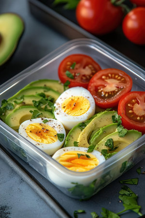 Healthy lunch box with boiled eggs, avocado and tomatoes on dark background