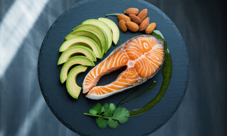 Raw salmon fillet, ripe avocados, olive oil, and a variety of nuts and seeds arranged on a wooden board, representing healthy fats and a balanced diet.