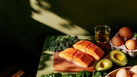 Fresh salmon, avocado, kale, and eggs arranged on a cutting board with olive oil, styled in soft light for clean eating, diet, and nutrition themes.