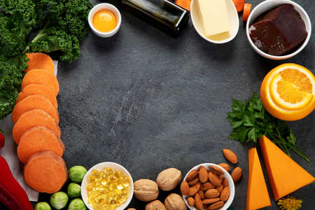 Foods high in vitamin A on dark background. Healthy diet concept. Top view, flat lay, copy space