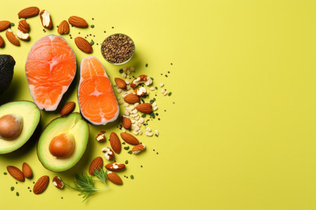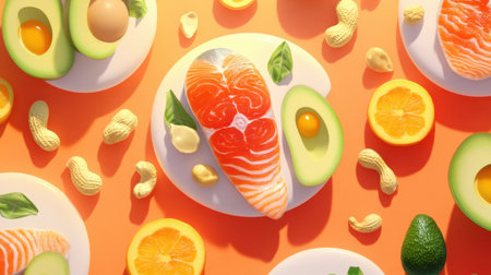 Colorful composition of keto-friendly ingredients - salmon, avocado, eggs, nuts, and seeds - arranged against a vibrant backdrop, providing an appealing visual for dietary and nutritional content.