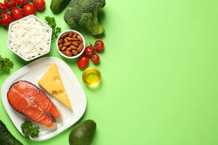 Different products on light green background, flat lay with space for text. Keto diet