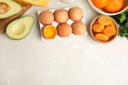 Foods high in vitamin D on light background. Healthy diet concept. Top view, flat lay, copy space