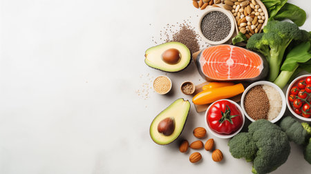 Ketogenic low carbs diet concept. Healthy balanced food with high content of healthy fats. Diet for the heart and blood vessels. Organic food ingredients, white marble background, copy space top view