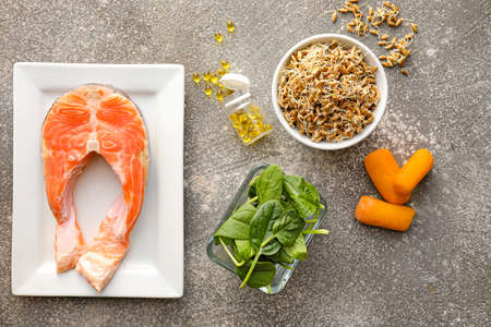 A piece of red fish on a wooden board. An assortment of useful protein sources and products for strengthening the body. Keto diet.