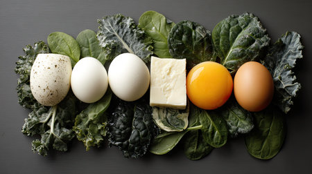 A visually appealing arrangement of assorted eggs and butter on vibrant green kale leaves. This image highlights fresh ingredients perfect for cooking or healthy meal planning.
