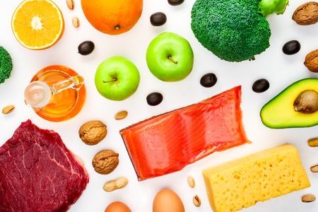 ketogenic low carbs diet - food selection on white wall