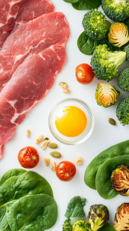 Raw steak surrounded by eggs, tomatoes, spinach, broccoli, Brussels sprouts, nuts, AI generated