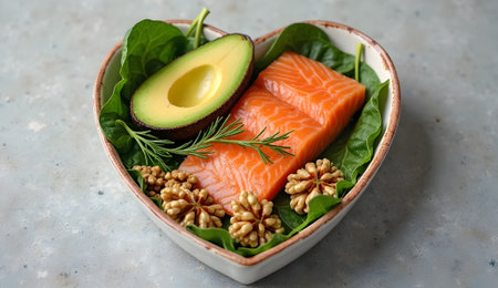 Healthy organic foods like salmon avocado spinach and walnuts on rustic table