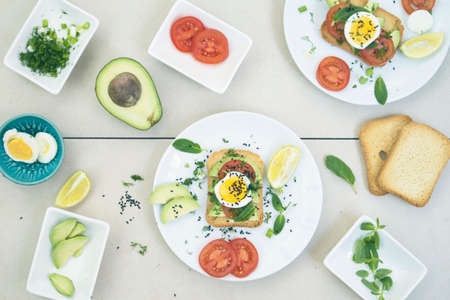 Avocado toasts on bread. Vegetarian food. Plant-based diet. Clean eating. Top view.
