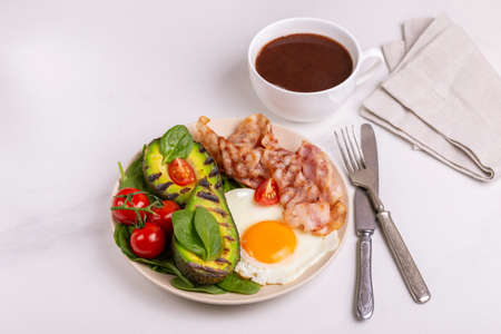 Grilled bacon and avocado, fried eggs with spinach and cherry tomatoes on light marble background. Ketogenic diet. Low carb high fat breakfast. Healthy food concept