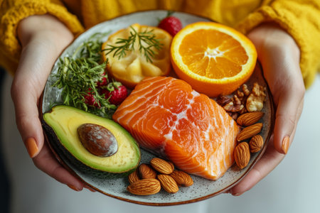 Close up of a healthy food plate with nuts, fish, and fruits on a white kitchen table