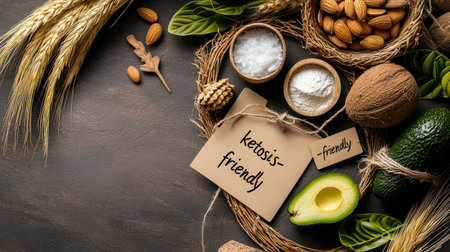 A visually appealing arrangement of keto-friendly foods, featuring avocados, nuts, and coconut, with labels emphasizing their dietary suitability.