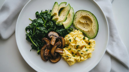 A delicious breakfast plate featuring fluffy scrambled eggs, fresh spinach, smoked salmon, and whole grain bread, offering vibrant colors and nutritious ingredients.