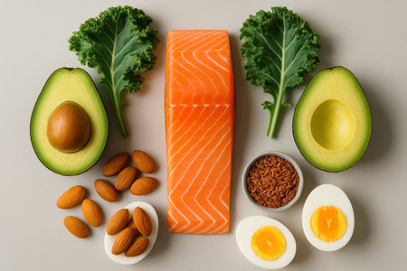 Fresh salmon fillet with avocado halves, kale leaves, hard boiled eggs, almonds, and flaxseeds arranged on neutral background.