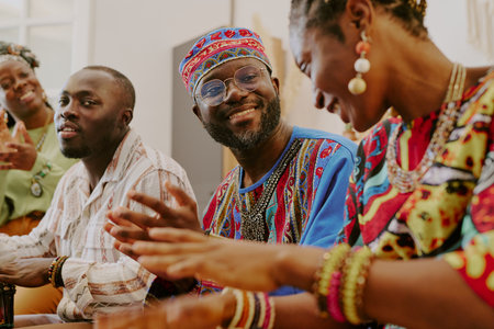 Group of Black adults celebrating Kwanzaa, sitting together and smiling while clapping hands, wearing traditional patterned clothing, engaging in festive cultural activity indoors