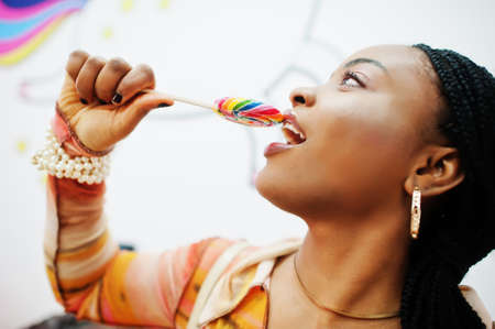 Beautiful afro-american woman with afro pigtails hairstyle and stylish clothes - Portrait of young black girl in studio