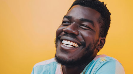 Side view. One young happy African handsome man isolated over gradient pink yellow neon background.